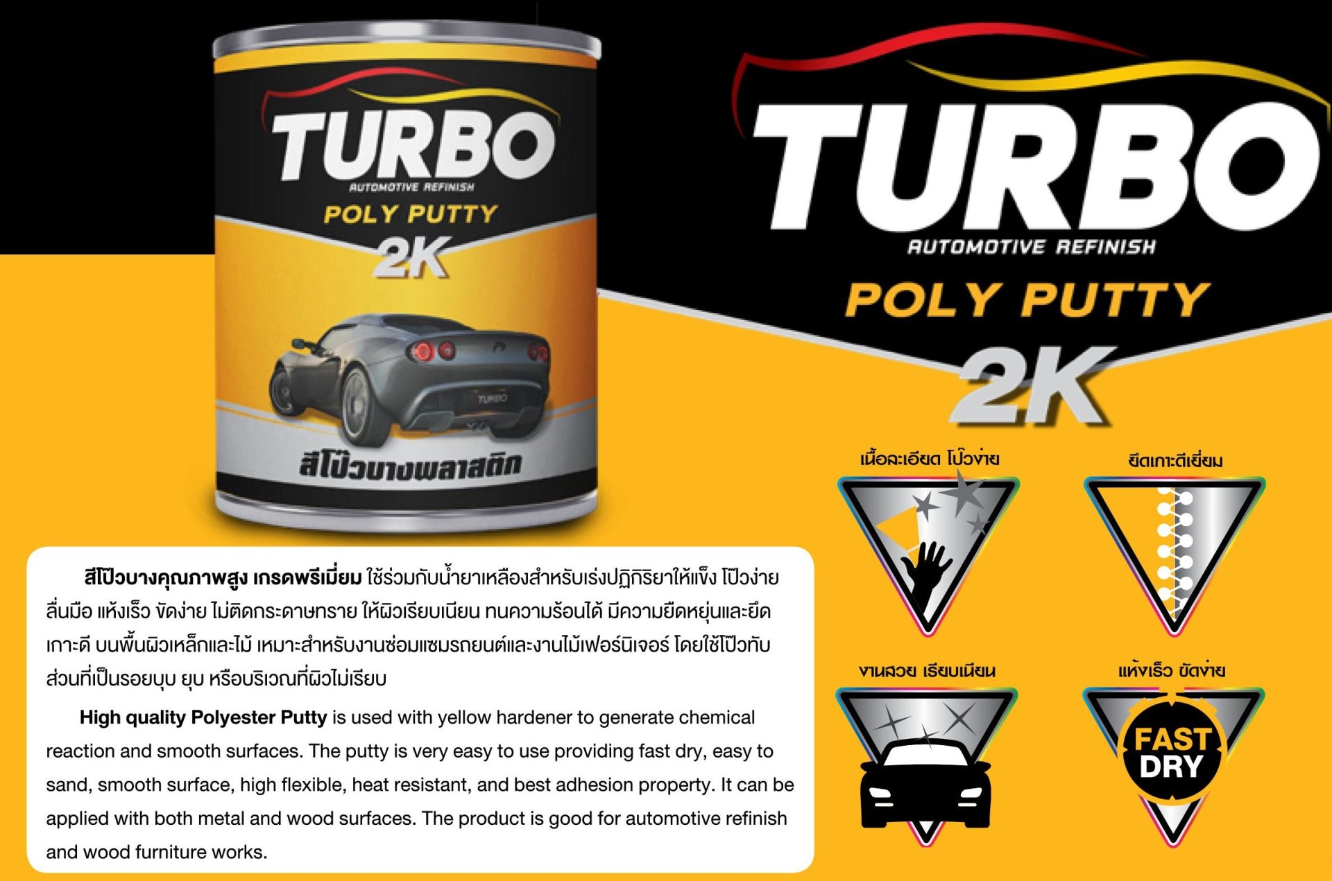 สีโป๊วบางคุณภาพสูง เกรดพรีเมี่ยม ใช้ร่วมกับน้ำยาเหลืองสำหรับเร่งปฏิกิริยาให้แข็งโป๊วง่ายลื่นมือ แห้งเร็วขัดง่าย ไม่ติดกระดาษทราย ให้ผิวเรียบเนียน ทนความร้อนได้ มีความยืดหยุ่นและยึดเกาะดี บนพื้นผิวเหล็กไม้ เหมาะสำหรับงานซ่อมแซมรถยนต์และงานไม้เฟอร์นิเจอร์ โดยใช้โป๊วกับส่วนที่เป็นรอยบุบ ยุบ หรือบริเวณที่ผิวไม่เรียบ